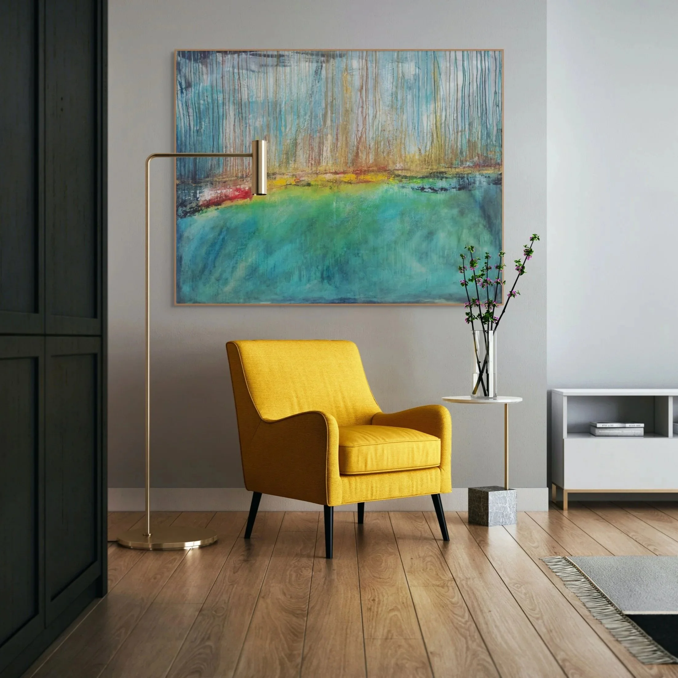 “The Rain Doesn’t Cry” emerges from a profound shift in perception — a moment when turbulence no longer feels like a threat, but a teacher. This collection is not about sorrow; it is about transformation. It explores the quiet alchemy that happens inside us when we stop resisting what life brings and instead allow it to move through. The works carry a soft luminosity that rises from within the layers, as if light were not painted on the surface but released from the depths of the canvas. Blues, greys, and muted neutrals blend with unexpected warmth, suggesting a world in which emotion is no longer heavy, but fluid — a landscape of renewal rather than collapse.In these paintings, rain becomes a metaphor for clarity: an element that washes, clears, and reveals. The textures hold traces of past storms, yet the overall sensibility is peaceful, introspective, and deliberately composed. There is a feminine intelligence at play — intuitive, adaptive, grounded in truth rather than spectacle.The Rain Doesn’t Cry reflects the moment when the self stops identifying with rupture and begins to inhabit awareness. It charts the movement from outer expression to inner essence — a return to calm, coherence, and presence. These works do not dramatize emotion; they distill it. They offer a quiet strength, a spaciousness, a sense of acceptance so deep it becomes illumination. In this collection, rain does not fall to grieve. It falls to cleanse, to soften, to awaken reminding us that transformation, at its core, is a form of gentle light.